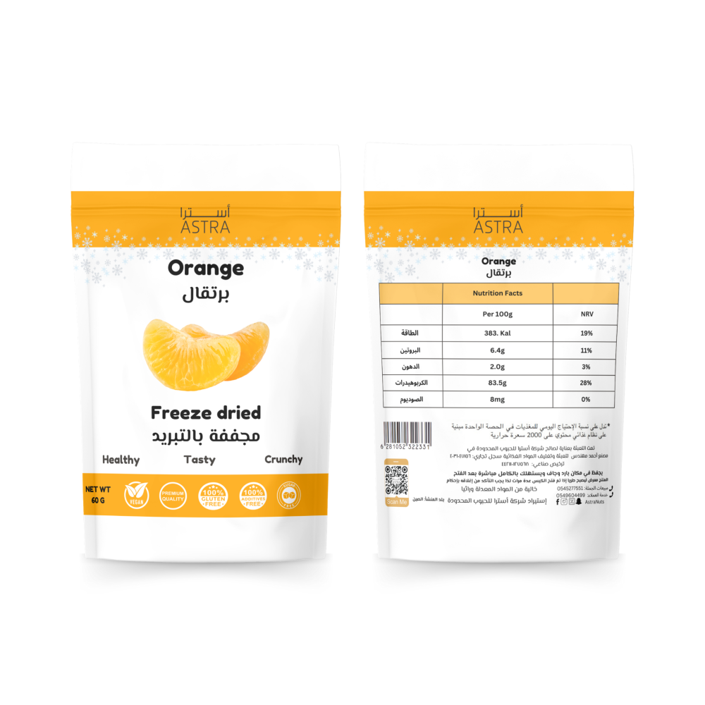 البرتقال المجفف بالتجميد (Freeze Dried Orange Fruits) هو طريقة مبتكرة للاستمتاع بنكهة البرتقال الطازج في أي وقت من اليوم، دون الحاجة إلى القلق بشأن فساد الفاكهة أو حاجة لتخزينها في الثلاجة. يتم تجفيف البرتقال باستخدام تقنية التجميد التي تحافظ على معظم العناصر الغذائية المهمة مثل فيتامين C، والألياف، والمعادن، مما يجعله خيارًا صحيًا ولذيذًا كوجبة خفيفة.