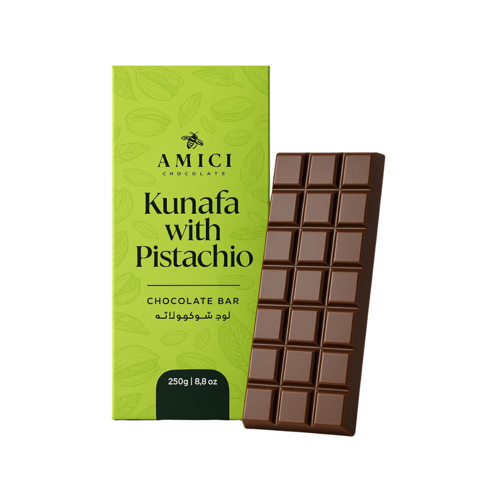 أميتشي شوكليت بار بحشوة الفستق هو حلوى فاخرة تجمع بين الشوكولاتة الغنية وحشوة الفستق اللذيذة، مما يوفر لك مزيجًا مثاليًا من الطعم المالح قليلاً والحلاوة اللذيذة. تتميز هذه الحلوى بمذاق مميز وقوام رائع، مما يجعلها خيارًا مثاليًا لعشاق الشوكولاتة والفستق على حد سواء. إليك تفاصيل عن هذه الحلوى الرائعة: