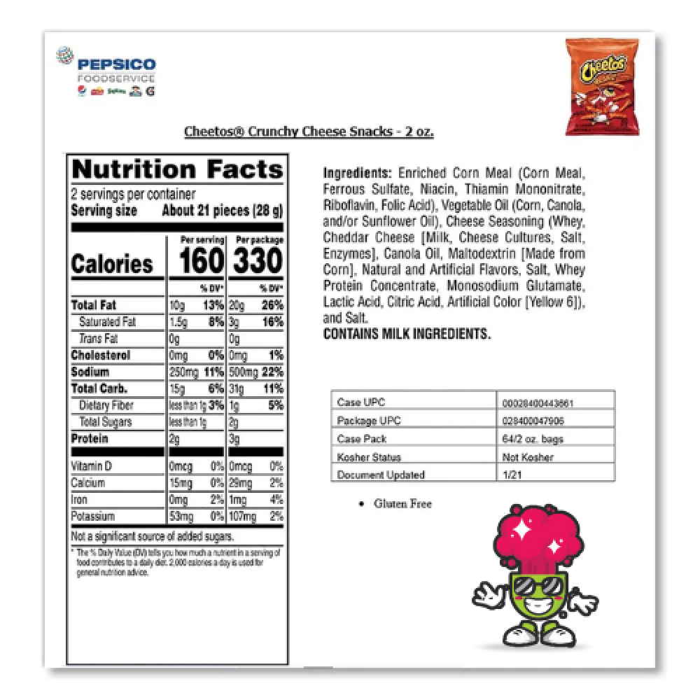تأتي عبوة Cheetos Crunchy Cheese Flavored Snacks بحجم مناسب لكافة الاحتياجات، سواء كنت ترغب في الاستمتاع بها بمفردك أو مشاركتها مع الأصدقاء والعائلة. إذا كنت في تجمع مع الأصدقاء أو في نزهة، فهي الوجبة المثالية لإضفاء المرح والمذاق الرائع في أي مناسبة.