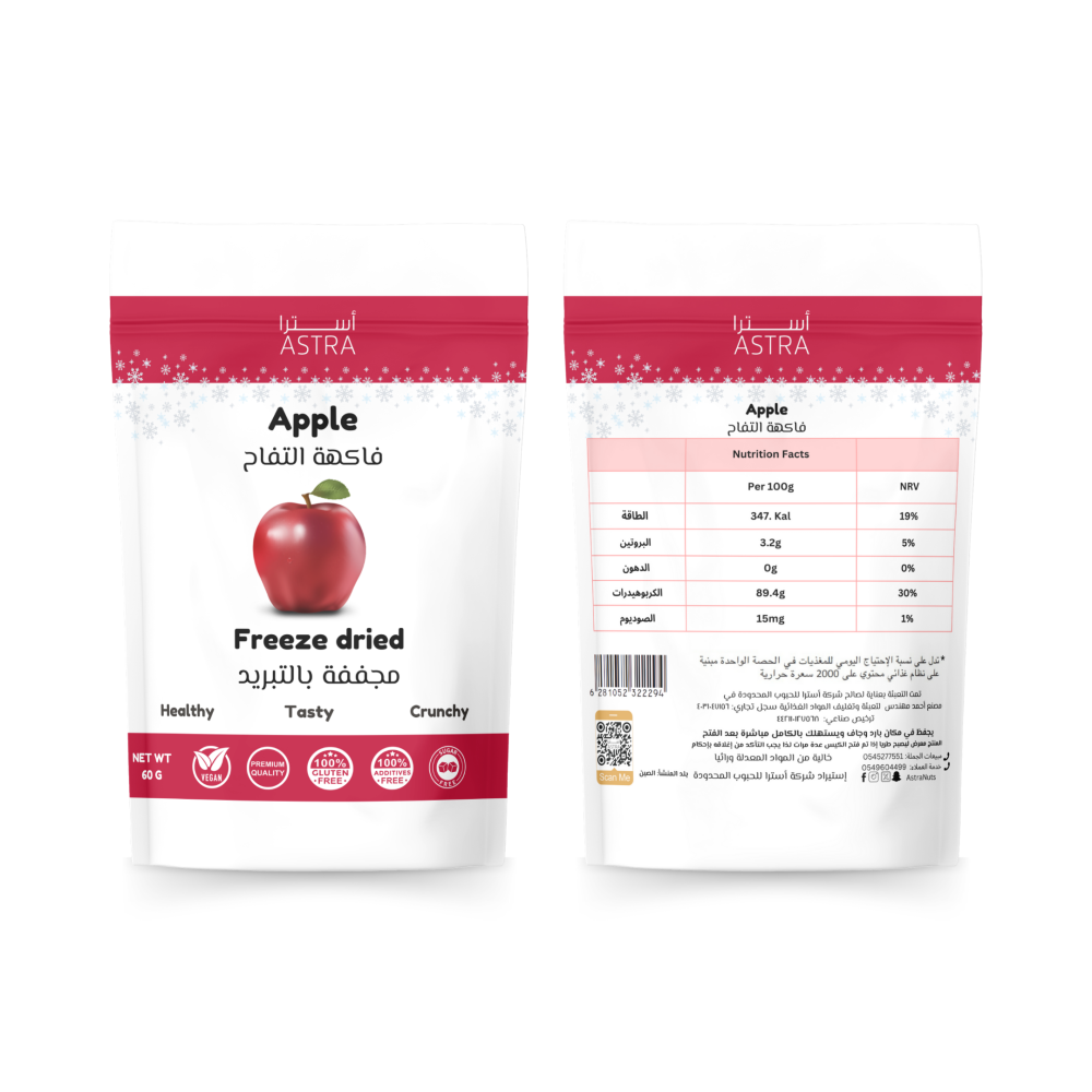 • المميزات:غني بالألياف: التفاح المجفف بالتجميد يحتوي على نسبة عالية من الألياف التي تساهم في تحسين الهضم والشعور بالشبع.